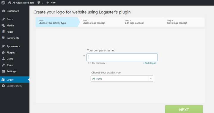 1) First download the wordpress plugin and install and activate it. Link: https://wordpress.org/plugins/logaster-logo-generator/